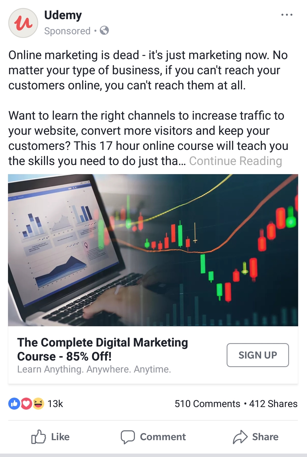 Unter Berücksichtigung dieser Hinweise können Sie Anzeigen erstellen, indem Sie ein Gefühl der Dringlichkeit und FOMO-Aufrufe nutzen. Sie können beispielsweise eine Facebook-Anzeige schalten, die nach einer Stunde abläuft. Diese Anzeige kann einen Gutscheincode enthalten, mit dem Nutzer einen Rabatt von 10% in Anspruch nehmen können. Dies wird die Aufmerksamkeit Ihrer Zielgruppe auf sich ziehen. Zusätzlich zu diesem Aufwand können Sie die Botschaft in Ihren Anzeigen und andere Inhaltsstrategien ändern, um über die Folgen von Unwissenheit zu sprechen. Das wird sie ansprechen und sie dazu drängen, Maßnahmen zu ergreifen, weil Sie das Problem angeben und Ihre Dienste als Lösung anbieten.