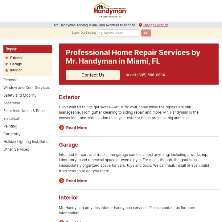 Sie haben ein Menü mit großen Kategorien: Exterieur, Garage, Interieur. Das ist kein schlechter Ausgangspunkt, aber jedes davon ist nur ein Teaser. Der Inhalt erklärt nicht wirklich, welche Probleme Sie lösen, wie Sie sie lösen oder warum Ihnen jemand in Miami mehr vertrauen sollte als den Dutzenden anderer Handwerkerdienste, die eine Google-Suche entfernt sind.