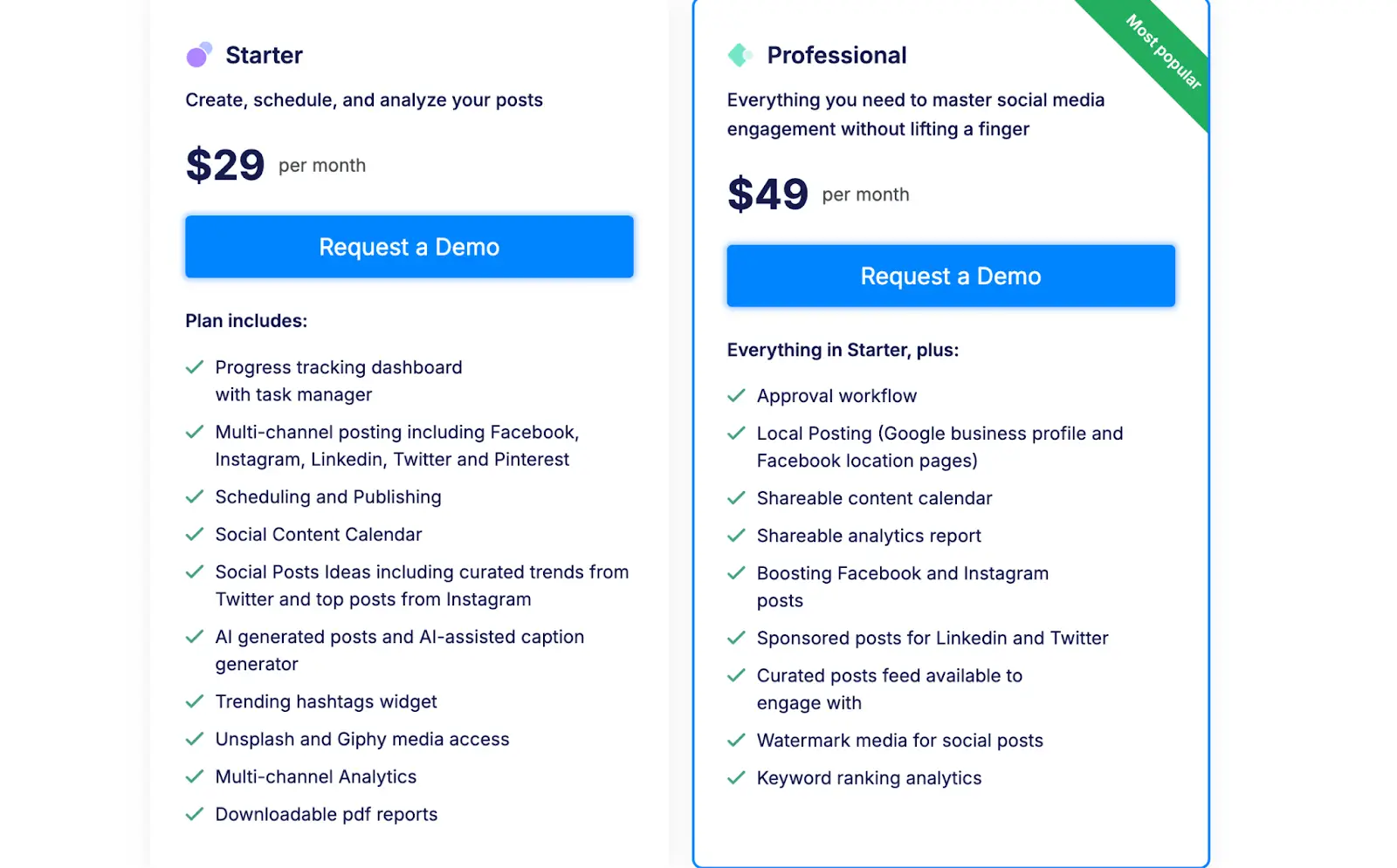 Buffer’s Pricing Module is much more affordable than Loomly, however, it lacks certain integrations, and AI capabilities and does not provide full-fledged reseller support for agencies. Customers also complain that the white label reporting feature is only available for the $100 plan and not otherwise, so it’s not a very affordable option for agencies.