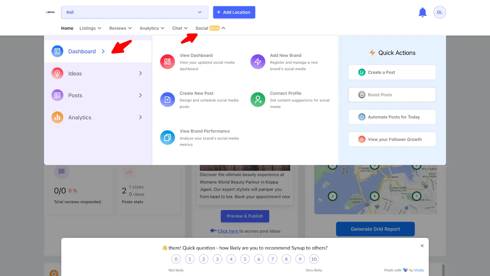 Sign up for a demo and we will show you how Synup Social can turn this around. Once your account is set up it’s quite simple from here onwards. Just connect your Google and Facebook profiles and we’ll sync everything for you. Next, to get started with managing your social media, all you have to do is, click on ‘Social’ and then ‘Dashboard’ where you can monitor all your social media activity.