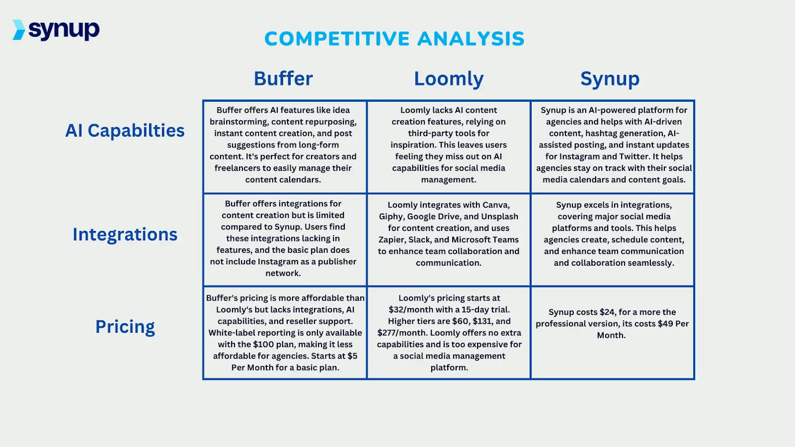 Buffer v/s Loomly v/s Synup Social: AI Capabilities