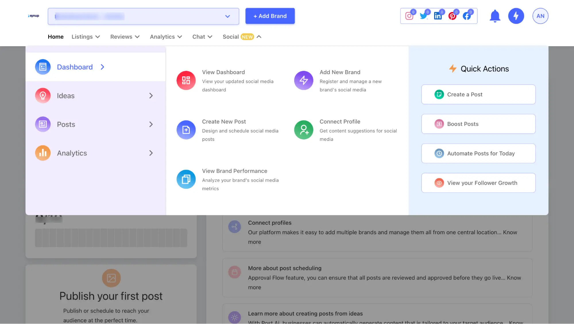 Once your Synup dashboard is all set, connect your Instagram handle with Synup in just a few clicks. On the top you’ll see the option to “Add Brand” to your profile.