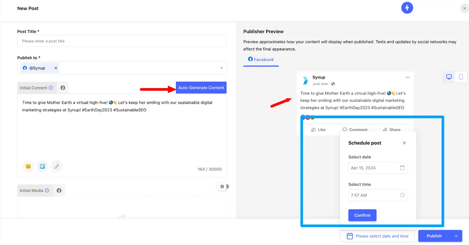 Once you add a brand account, you can simply start posting. Synup lets you publish directly as well schedule posts for later. You can also send a post to a team member for approval. If you’re facing a block, our platform has an AI content generator integrated within our posting workflow. Simply click “Auto-generate content” and you will get ready-to-go AI-generated content ideas in seconds.
