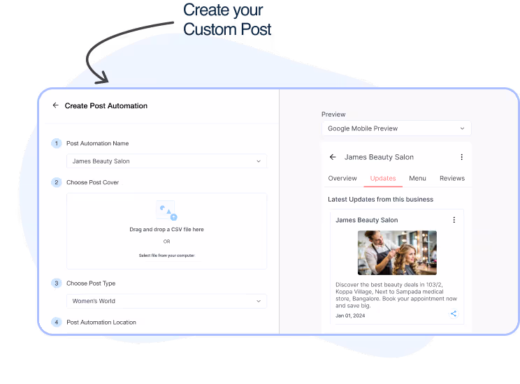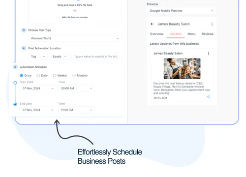 Schedule your Google business profile posts with our powerful automations. Create bulk posts for specific cities, store codes, business categories, and more.