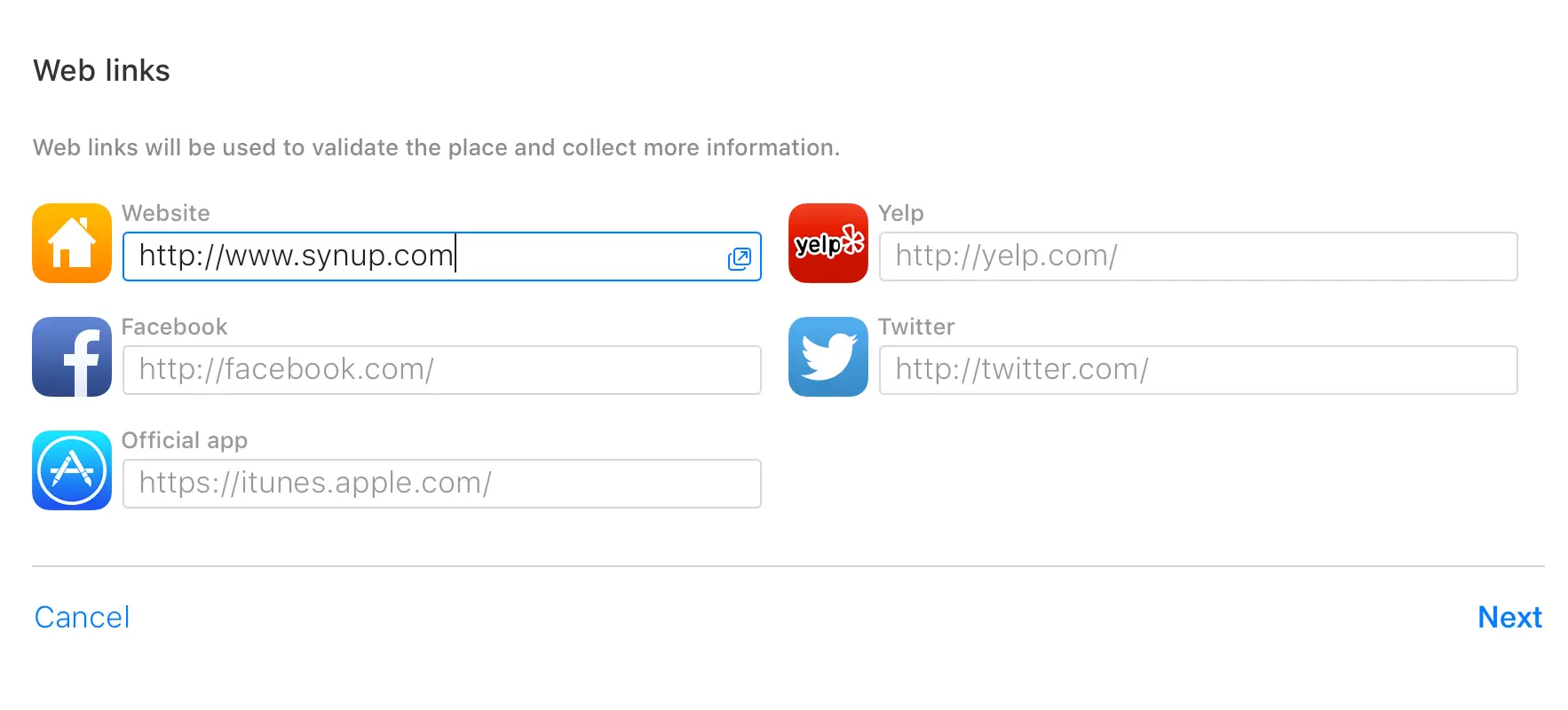 It’s important that you add your website and social media links to your Apple to ensure that customers are able to go to your website for additional information as well as follow you on social media for latest updates.