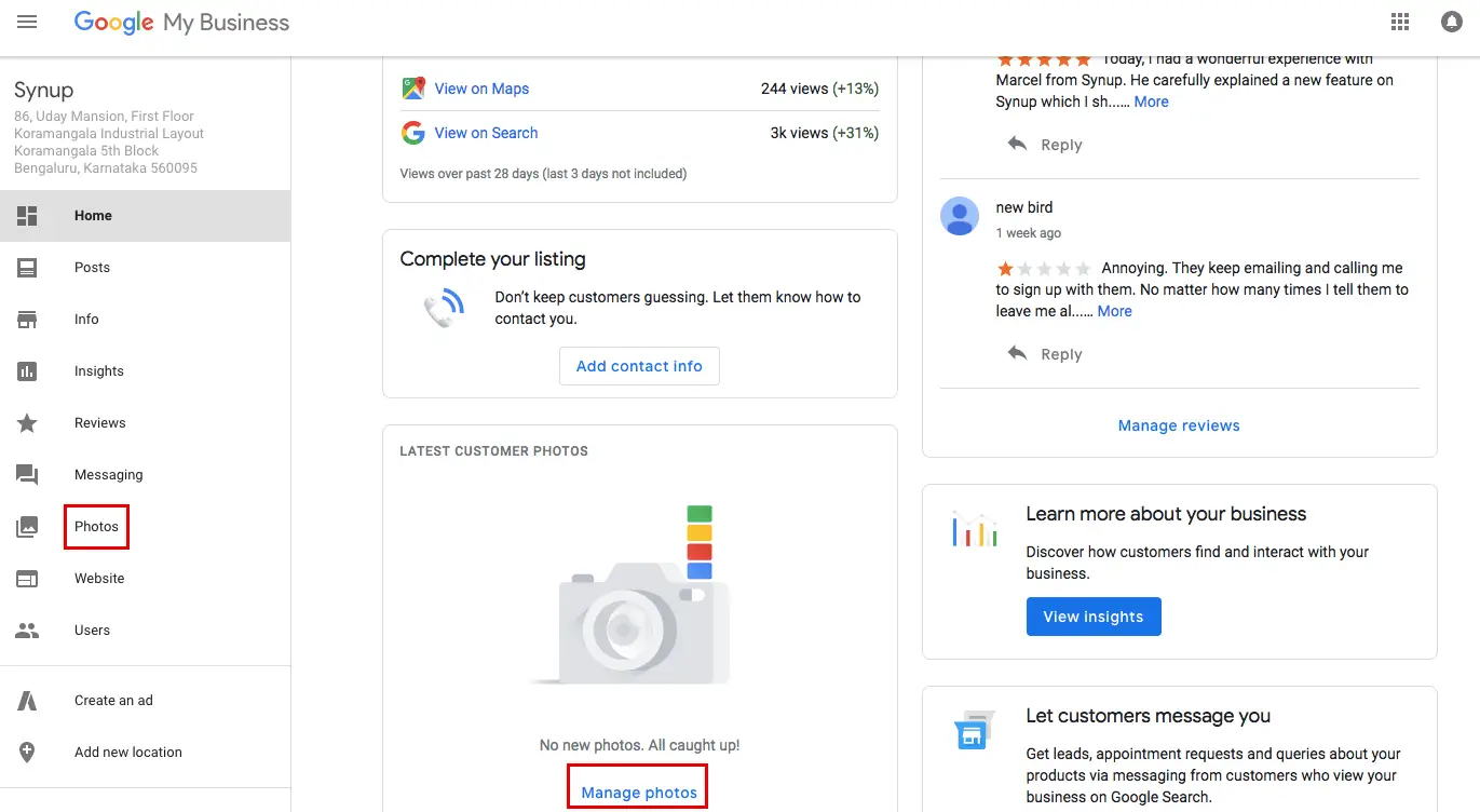 On the “Home” pane of your business listing, scroll down until you see a “Manage Photos” button. Click that to get to the Photos pane. You can alternatively click on the Photos button on the left sidebar to get to this window.