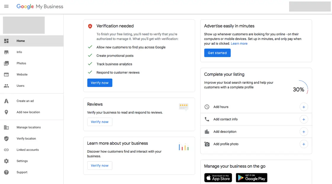 Google might take you through a quick phone verification process. Once you’re done with that, you’ll be shown a window like this one, where you’ll need to type in your business’ name.