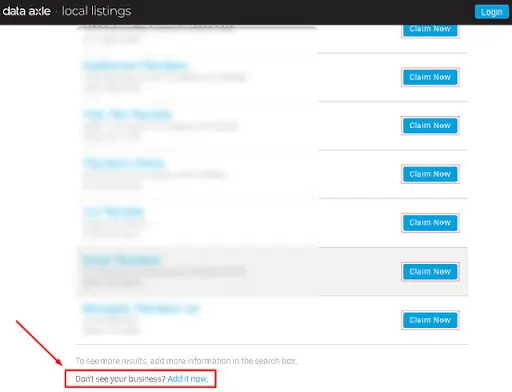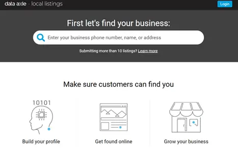 The CitySearch site is operated by Citygrid and uses Data Axle for business information. To add your business to CitySearch, you need to go to https://local-listings.data-axle.com/search to input company information. Type in your business name, address, or telephone number in the search box.