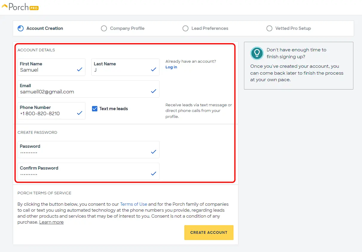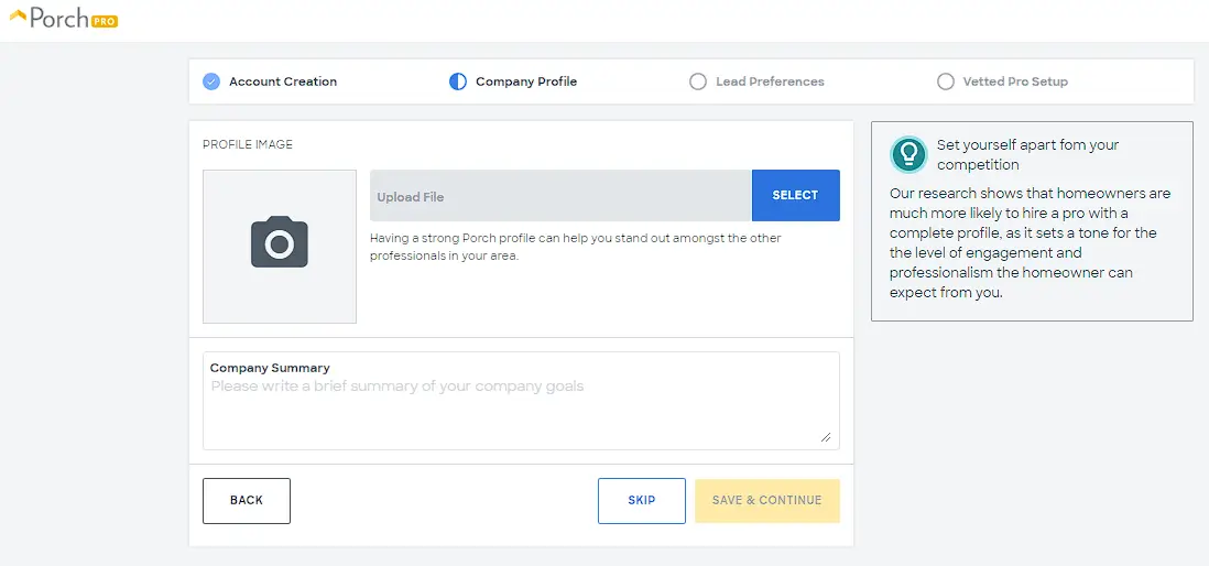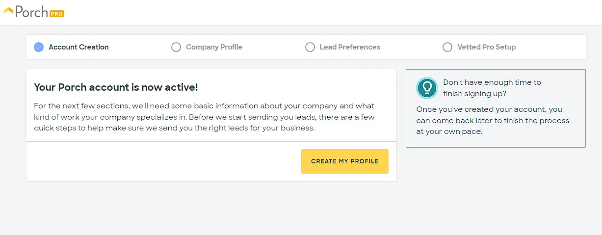 - Followed by, Click “Create My Profile” to complete your business profile, lead preferences and process to vet your leads.