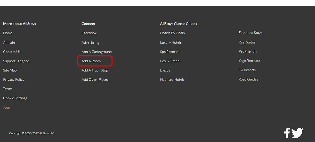 - Navigate to the footer and click the “Add A Room” link under the Connect.