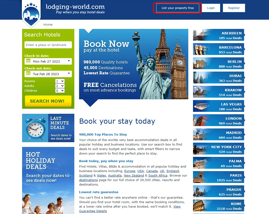 - Go to the eDreams website (https://www.lodging-world.com/) and click “List your property free” button.