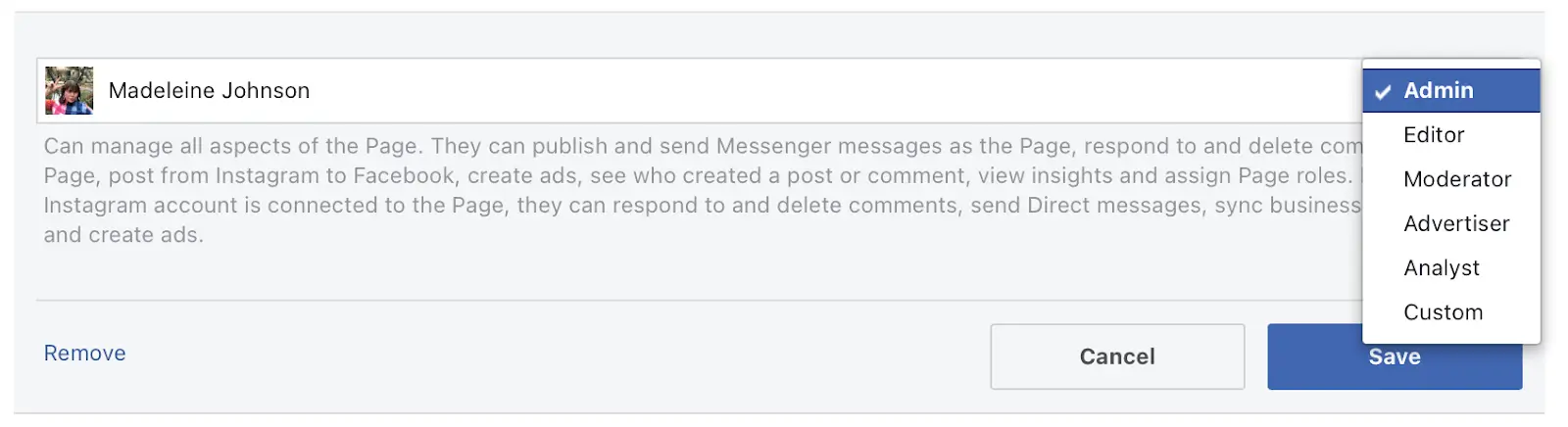 An admin has complete control of the Page’s attributes and actions, including managing Page roles. An editor can do nearly everything that an admin can - except change Page roles. Moderators can manage comments, make posts, send messages, create ads, and more. Advertisers create ads and view post analytics, while analysts just have access to post data. If none of these seem to fit what you need for your business, you can even create a role with custom permissions!