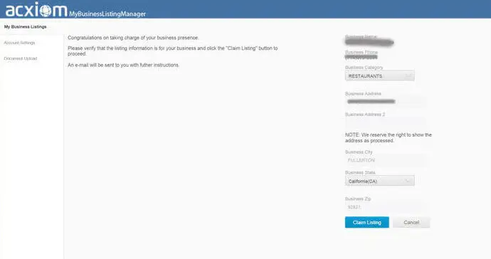 Go to Acxiom Business Listing Manager and search for your business using your “Phone No.” or “Business Name” and State.