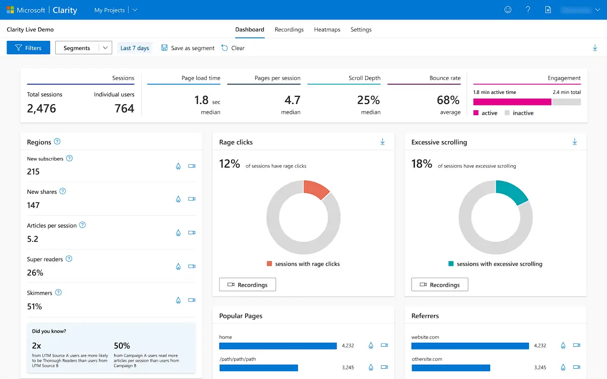 - You can now use Microsoft Clarity to analyze your website's user experience, including session recordings, heatmaps, funnels, and more.