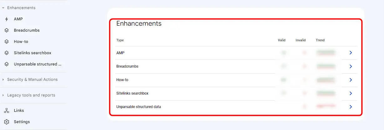 - In the "Enhancements" section, click on "Structured Data" or “Unparsable Structured Data” to access the report. This report will show you any errors or issues with the structured data on your website.