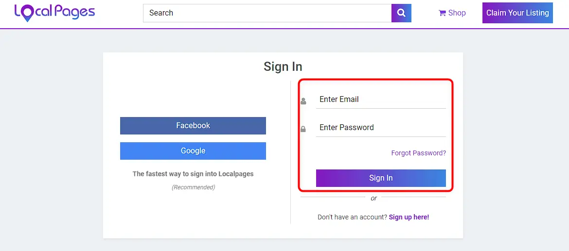 Step 3: If you already have an account with localpages.com, sign in using your username and password. If you don't have an account, create one by updating the contact information.