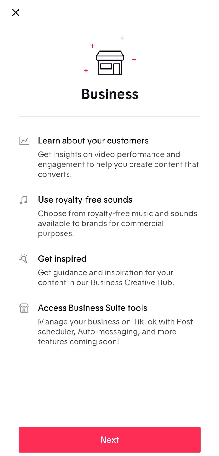 The next page to pop up will tell you about the benefits of TikTok business accounts, including: