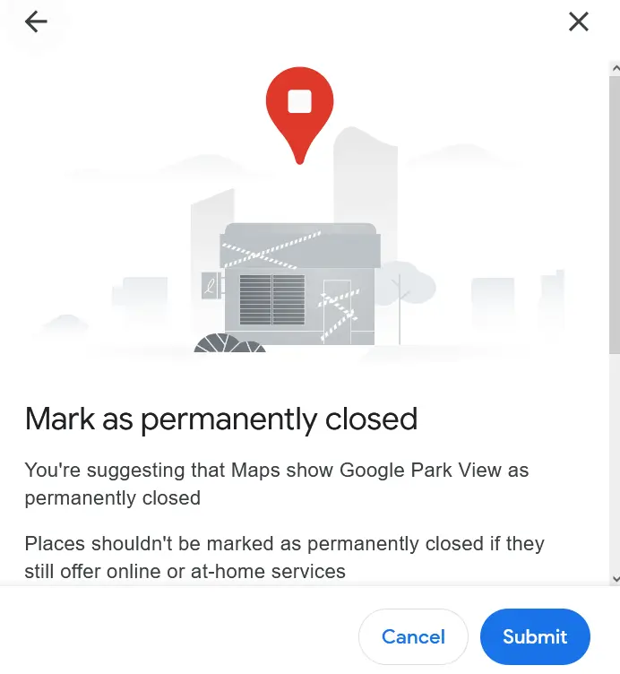 Select the reason for your edit request to tell Google why you want the Maps listing removed. You can let them know your business is temporarily or permanently closed, for example. Or report the location doesn’t actually exist or any other problem with the listing as it’s currently displayed.