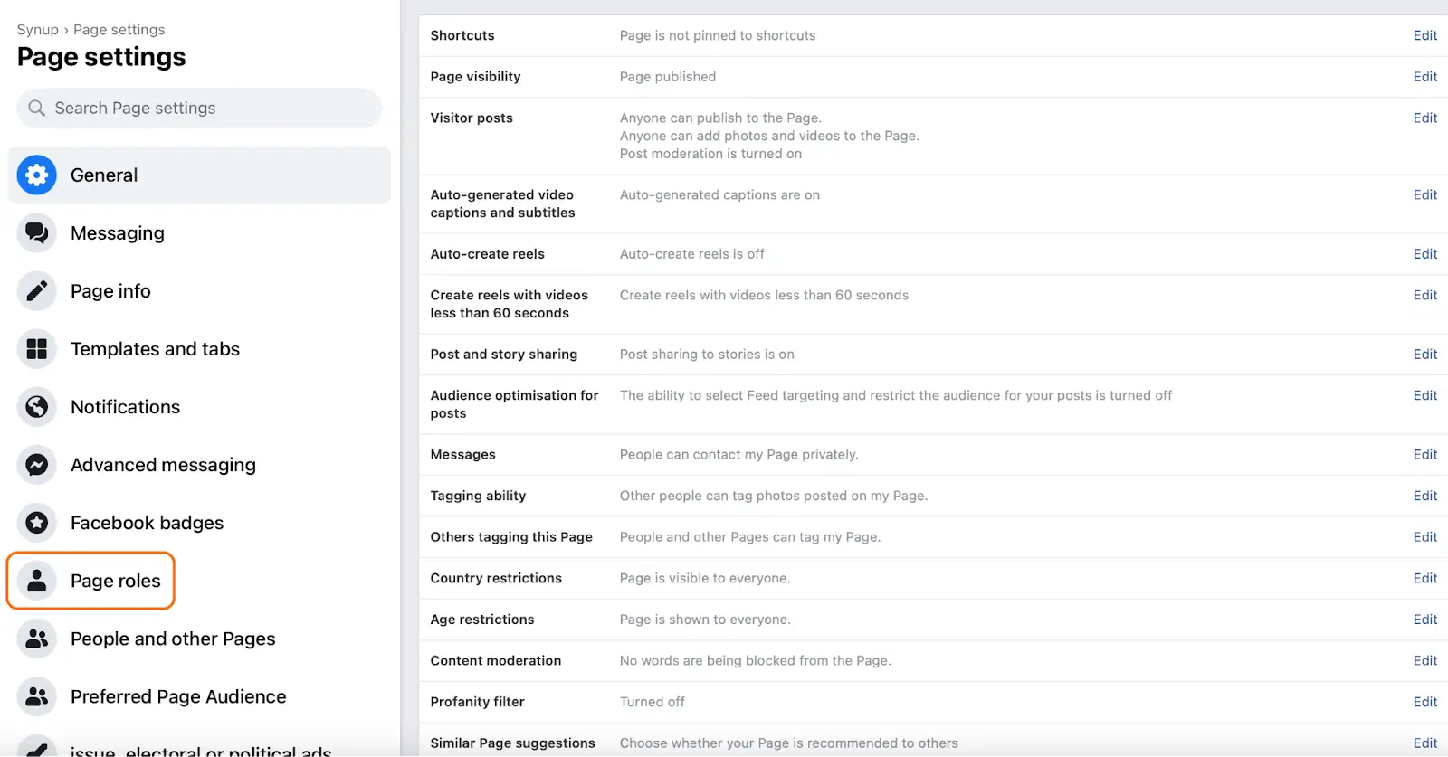 Step 3. Once you’ve navigated to “Page settings”, click on “Page roles”. This is where you can see who manages your Page at-a-glance, and assign new people to manage your page.