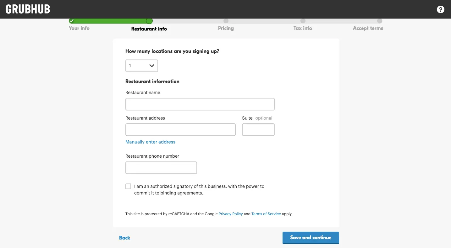 If you have more than one location, you will need to enter the information about the first restaurant you’d like to add. The GrubHub team will get in touch with you to complete the registration process for the rest.