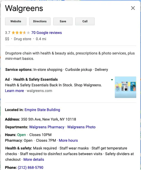 That’s not all Walgreens does. They are also taking advantage of and owning that ad space on a competitors’ google profile. To the right is a local pharmacy’s profile. Under the Google Ad, you’ll see the URL will redirect customers to Walgreens.