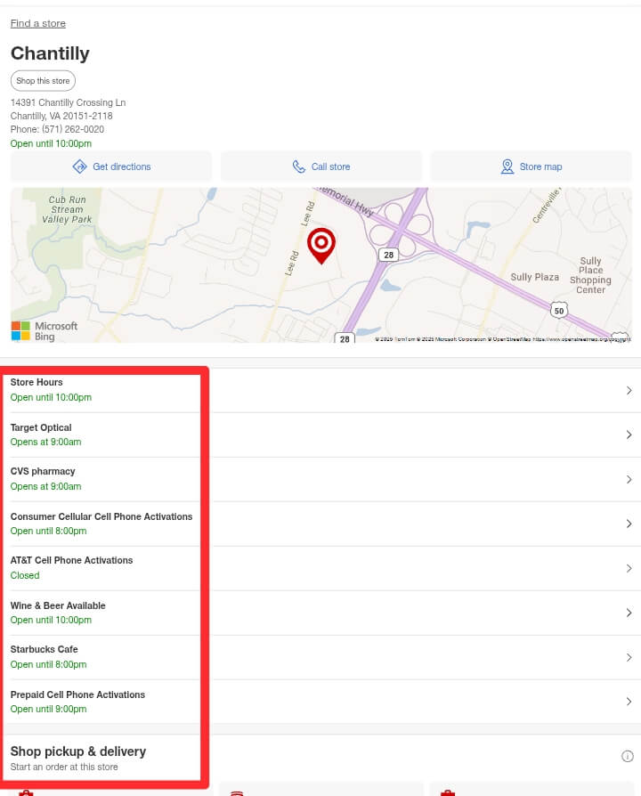 Example: Target’s store locator not only gives directions but also shows current store promotions and details about store services, helping customers plan their visit.