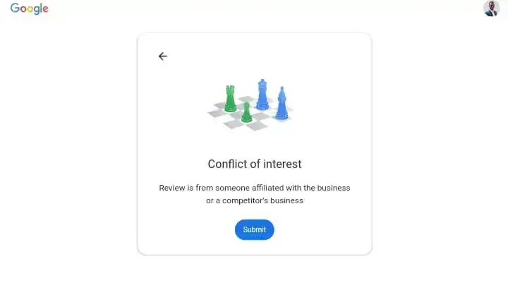 - Conflict of Interest: Sometimes, competitors or even people within your own business might post reviews. That’s a clear conflict of interest and against Google’s policy. For instance, a tech store may notice a string of poor reviews from its own staff after, possibly, a delayed salary. You can report them, and the reviews will vanish.