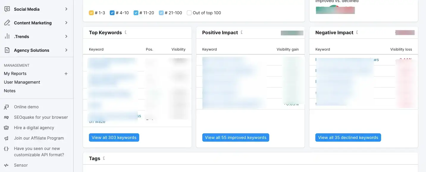- In SEMrush, you can go to position tracking, select the domain, and then look at the top keywords for visibility and ranking gain.