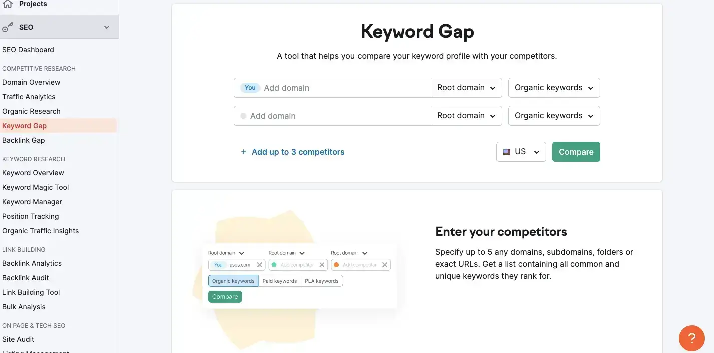 SEO tools like SEMrush and AHref have competitor analytics tools that give you an overview of all these metrics for your competing domains. If you want to go a step further, you can also do a site-wide audit for your competitor’s domain using tools like Ubersuggest.