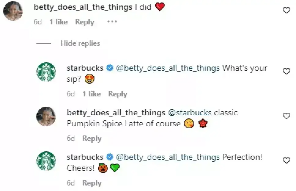For example, Starbucks is upbeat, intelligent, and exuberant online. We’re sure the user in the above example was thrilled that Starbucks replied to her comment! Replying to follower messages or comments goes a long way in fostering connection.