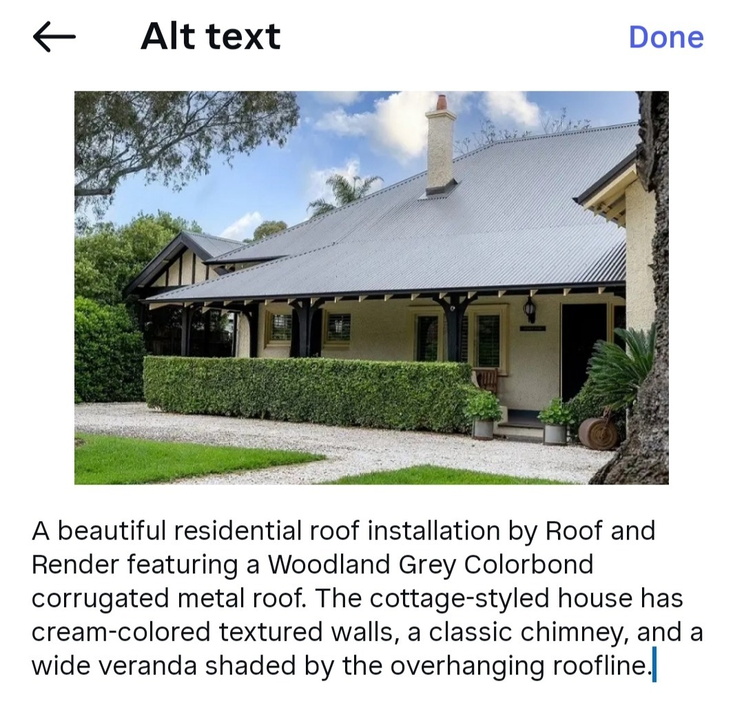 If you post a photo of a newly installed roof, the Alt Text should say Residential roof installation by [Company Name] in [City].