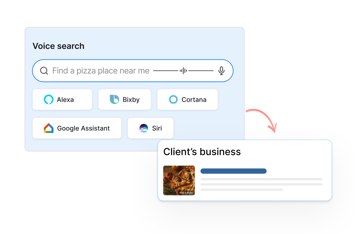 Sync and optimize your clients’ listings across major voice assistants like Google Assistant, Amazon Alexa, Apple Siri, and Microsoft Cortana. So, they appear when it matters most.