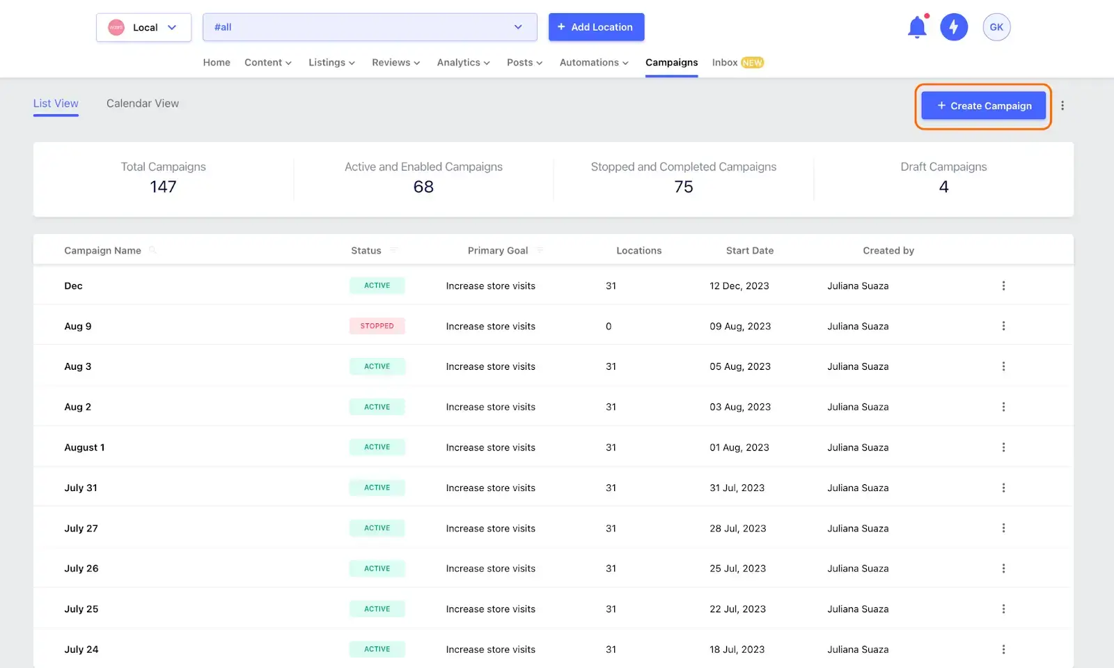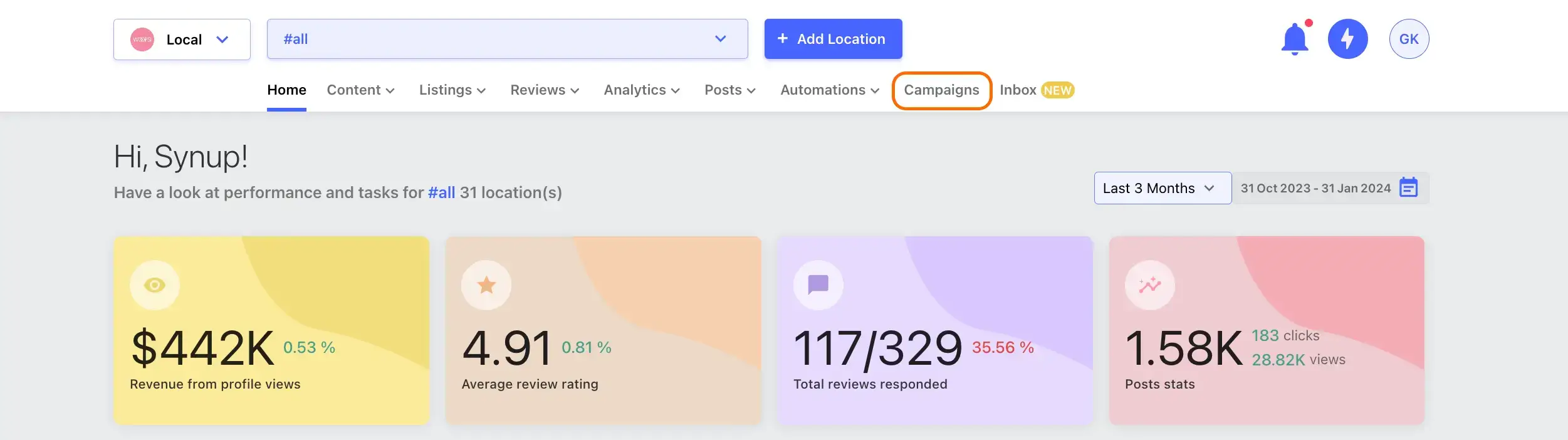 To get started, head over to the “Campaigns” tab on the Synup dashboard