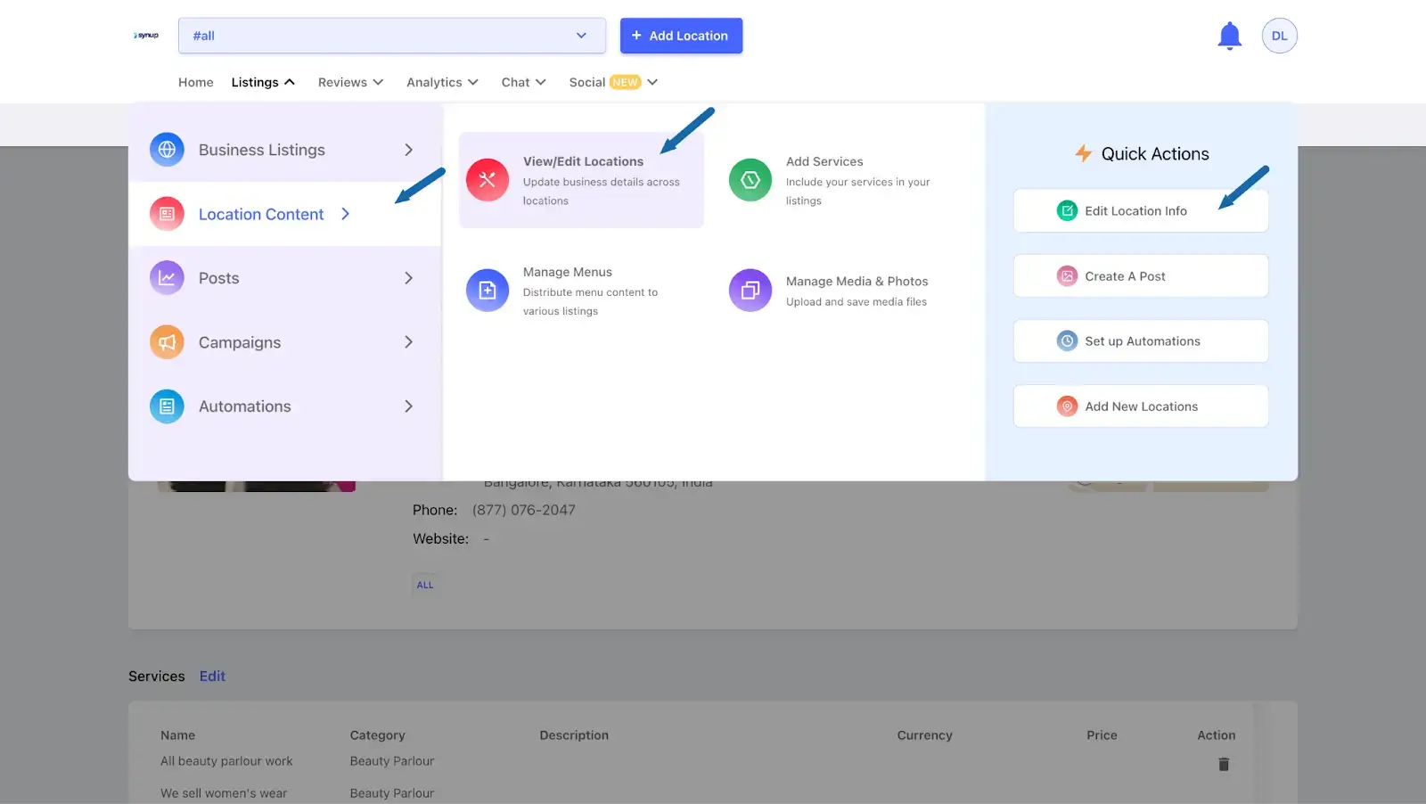 Log in to your Synup account and navigate to Location Content. In the drop-down menu, you can either select how to view/edit locations or access it from the quick actions section by clicking on Edit Location Info.