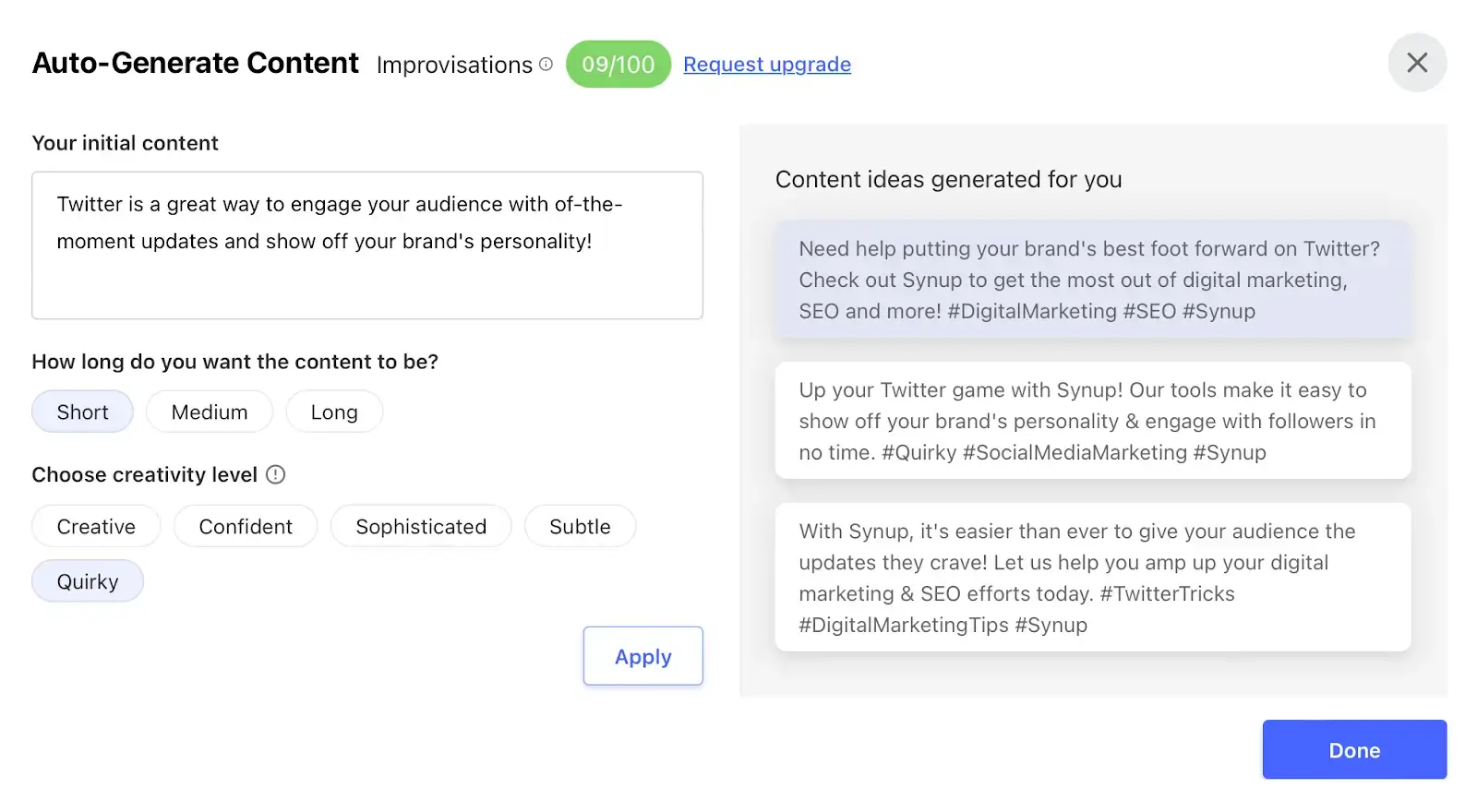 With Synup Social, it’s easier than ever to brainstorm topics and create engaging Twitter threads. To create a thread that will keep your audience hooked until the last character: