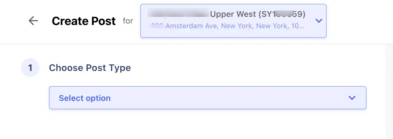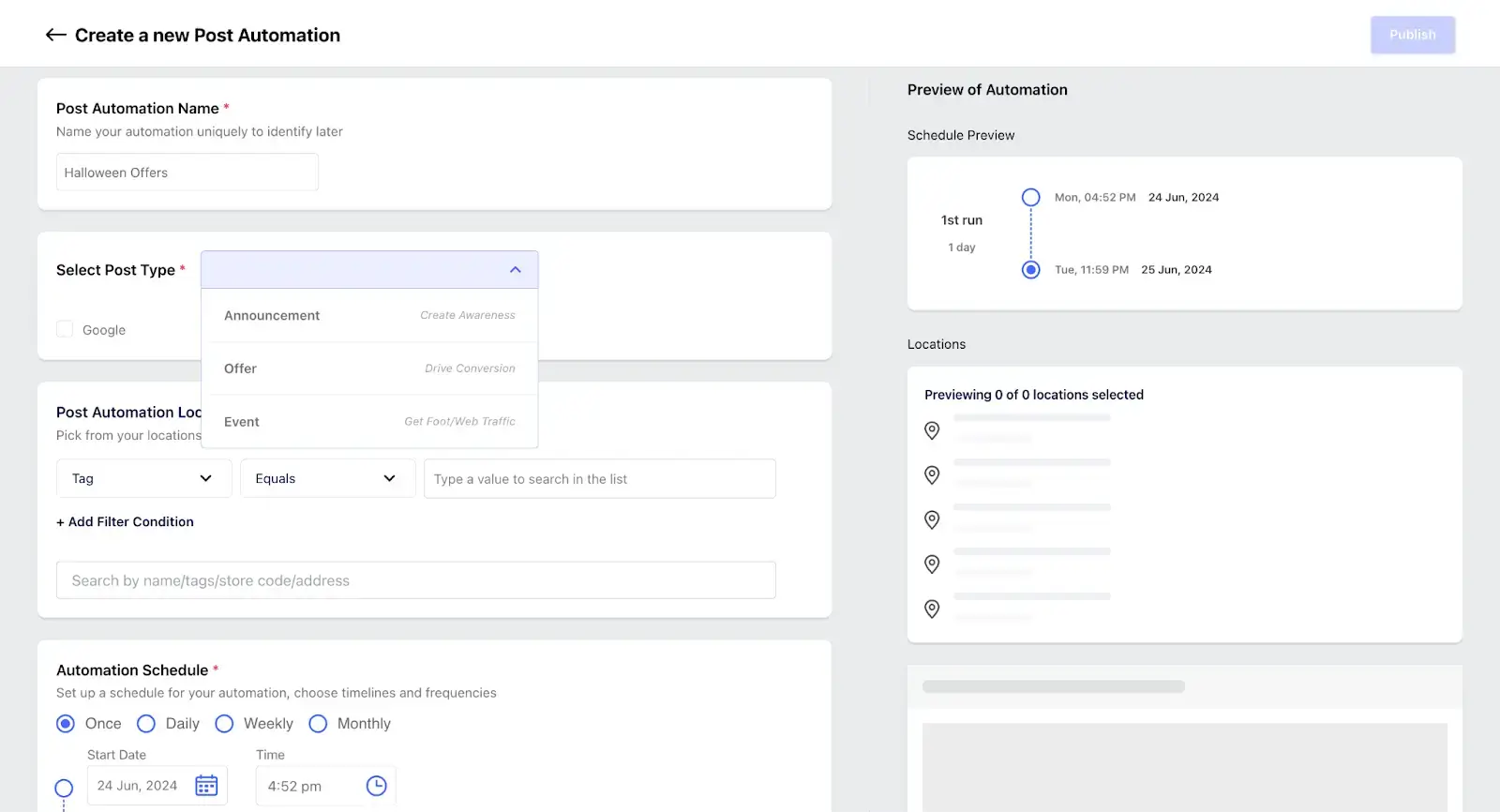 Step 2: Select a post type, network, locations where you want the posts to run. We let you pick locations based on multiple parameters – store code, location ID, tags, name, city, and a lot more.