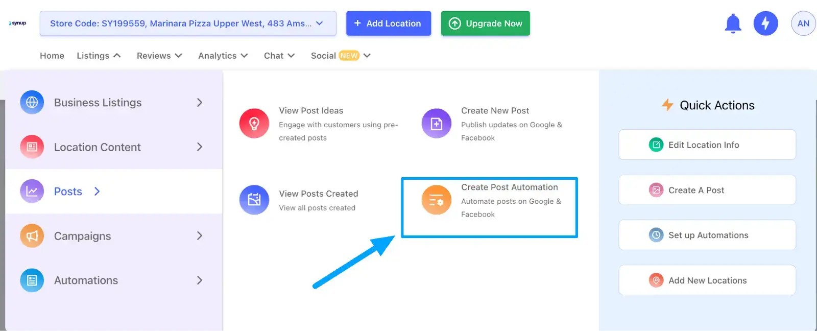 Step 1: On your Synup dashboard, navigate to the "Listings" tab in the menu and select "Posts" > “Create post automation”