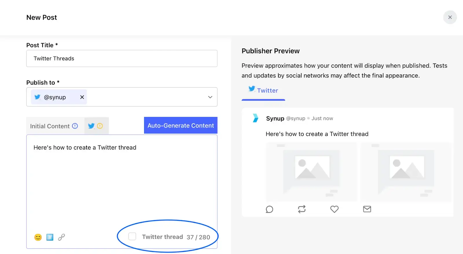 Check the “Twitter thread” box, and start typing to create a thread. Your thread can be as long as you want (unlike a typical tweet) - and contain links, images, or anything you want.