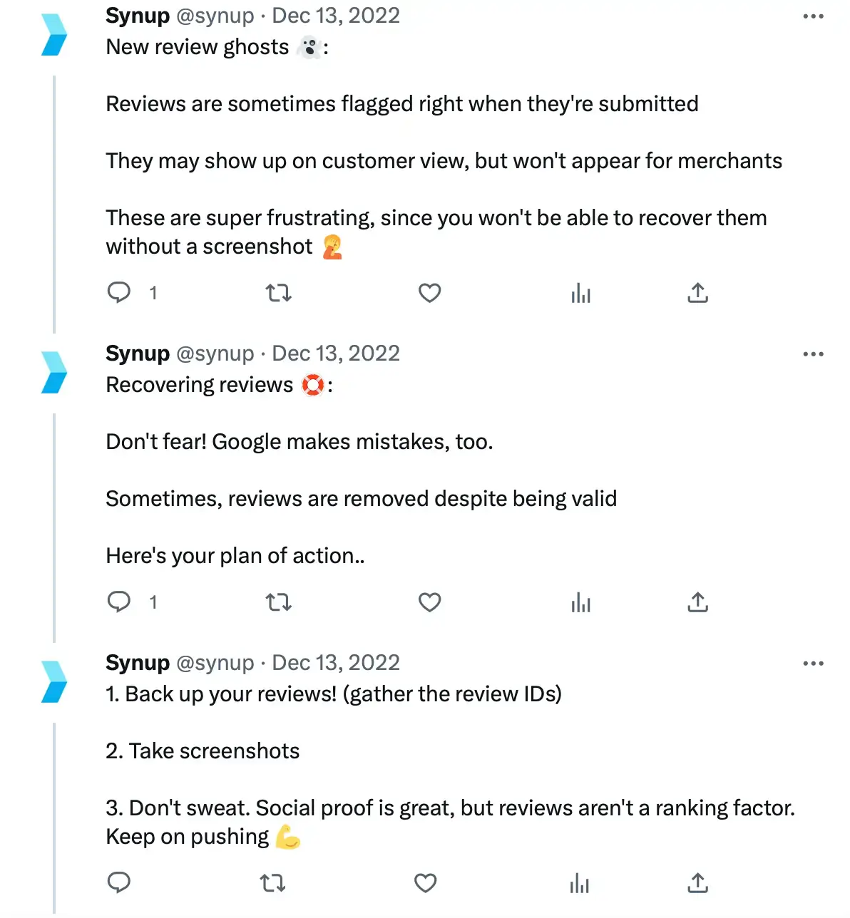 Here, we were teaching our audience about disappearing reviews - and how to combat them. Because we separated our points into individual tweets, our audience can scroll to find the information they care most about (presumably, recovering their reviews). But users who want to know more can stop and read the whole thread, too!