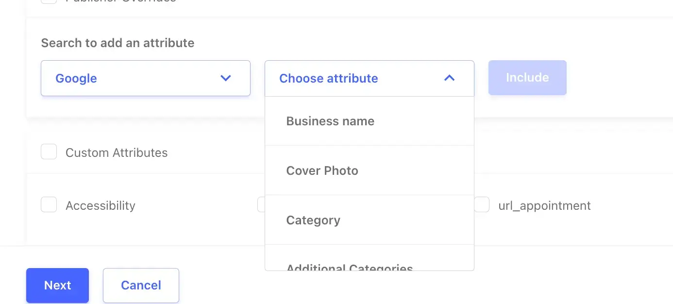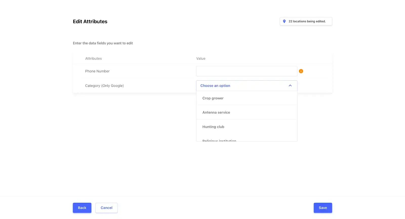 Step 3: Next, you’ll see the list of attributes you can edit for those locations. Select ‘Google’ as the publisher. You can also select additional attributes to edit on the locations.
