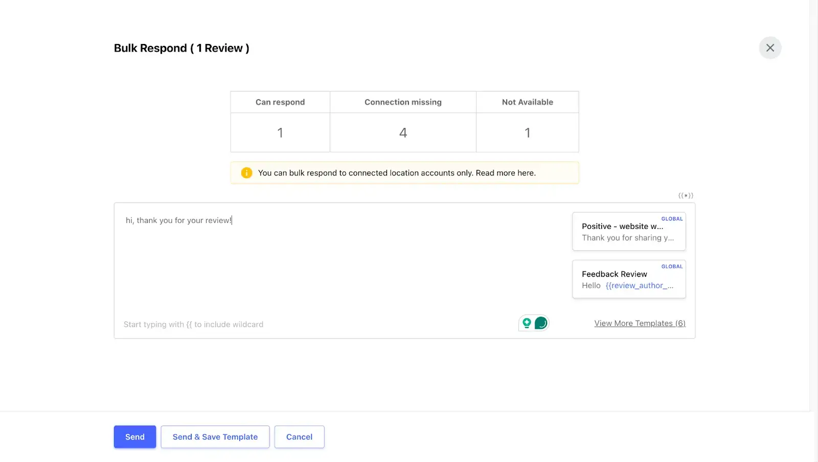 Step 7: Here, you can quickly respond to all your reviews by clicking the "respond" button. You will then be able to see all the reviews that the system can respond to in bulk and be notified if any connections are missing, as shown when you're redirected to a page like this.