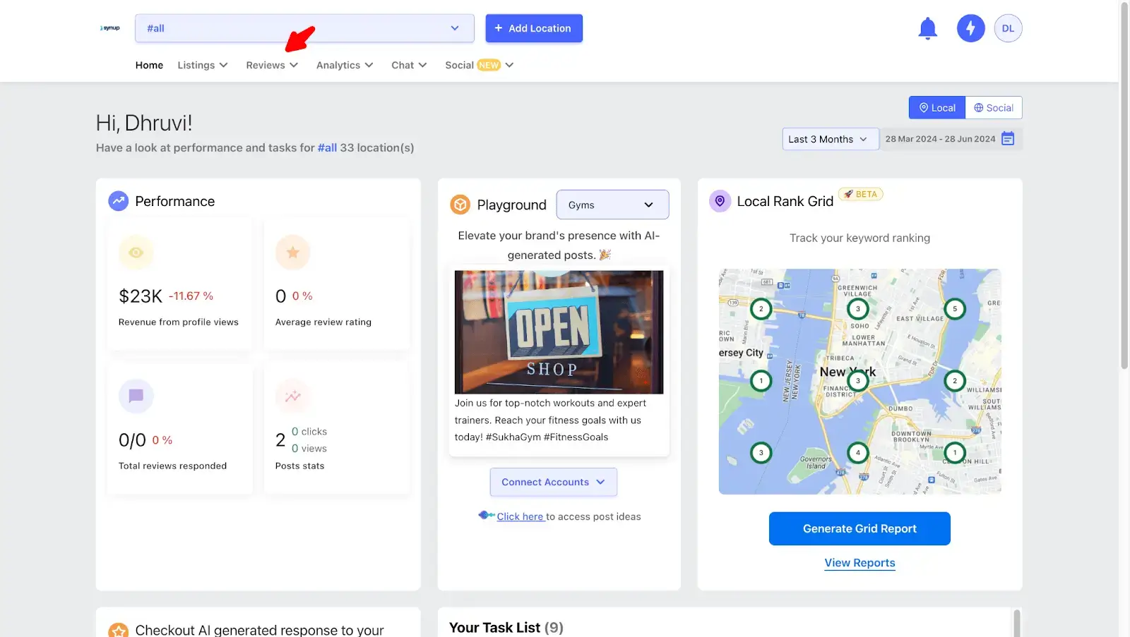 Step 1: Log in to your Synup dashboard and click on “Reviews”, this is where you will usually find everything you need for review management.