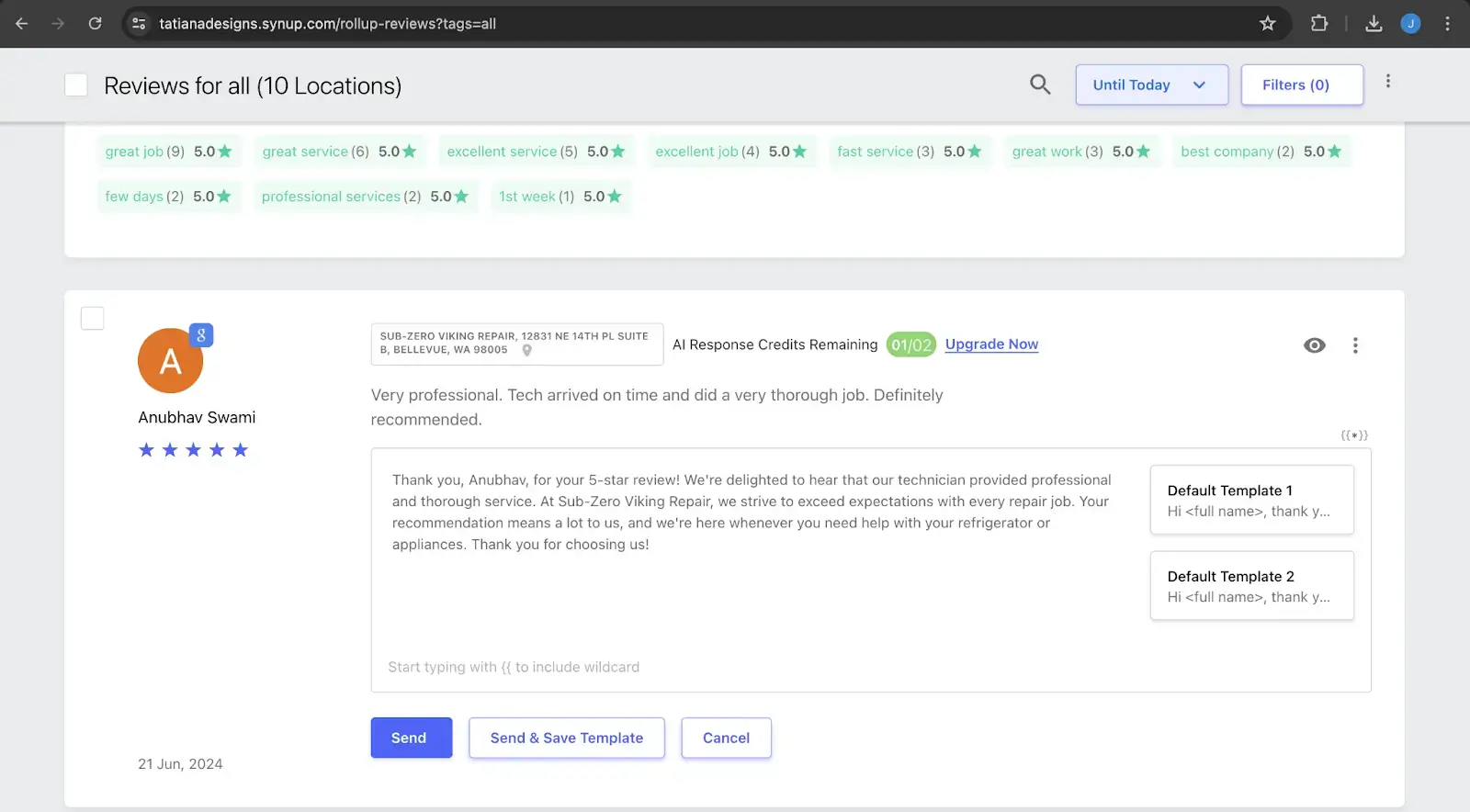Effortlessly respond to Google reviews with Synup’s AI. Craft personalized replies that reflect your brand’s tone—fast, professional, scalable.