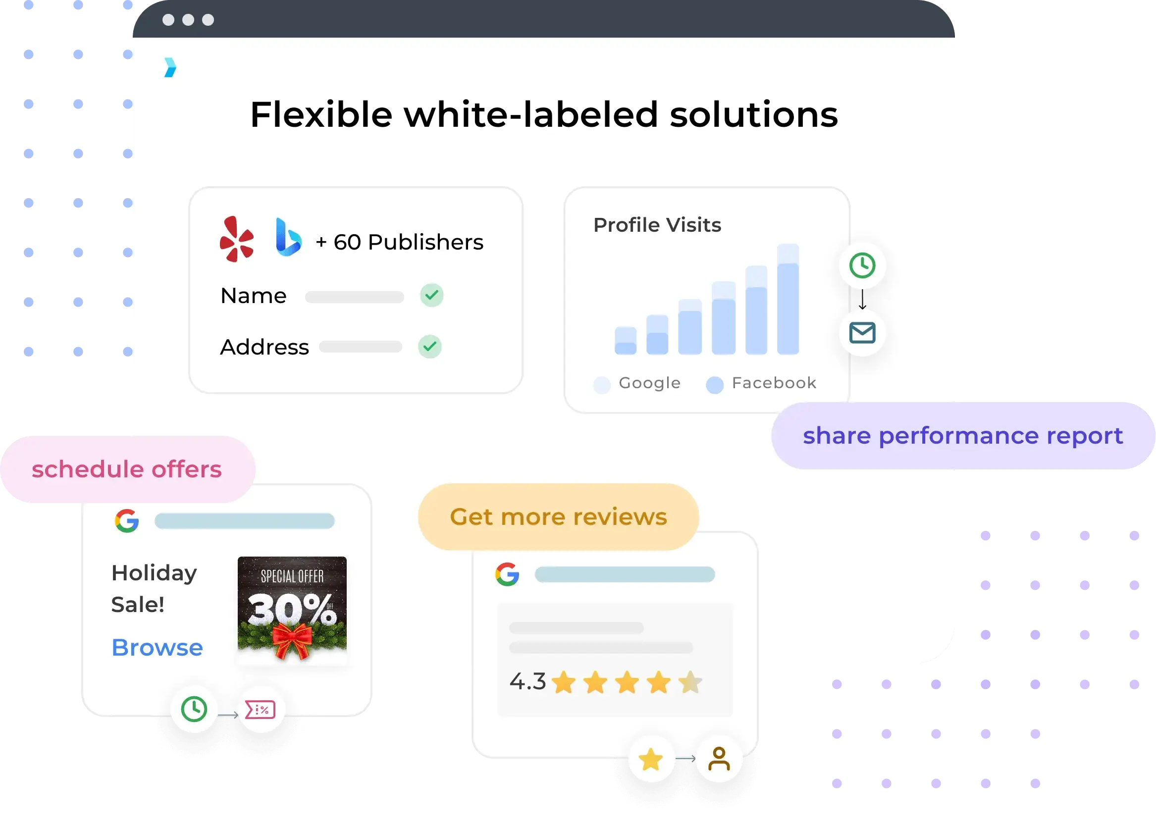 Mejore la experiencia de sus clientes con un portal totalmente personalizado, un dominio personalizado y paneles e informes de marca blanca. Revende paquetes completos de productos de marketing con tu marca y obtén ingresos recurrentes sin costes de desarrollo.