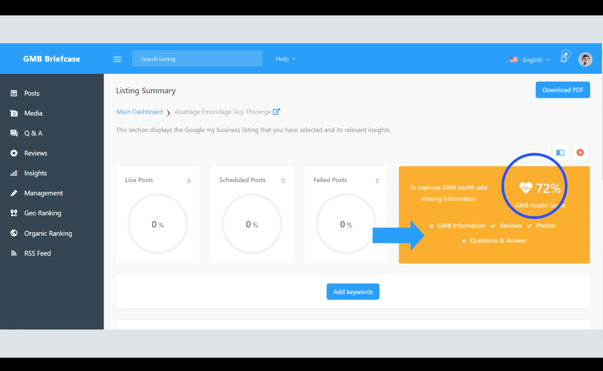 Visualice sus datos de clasificación local a través de paneles fáciles de usar que consolidan todas sus métricas de rendimiento en una ubicación centralizada. De un vistazo, puedes analizar tu visibilidad en las búsquedas e identificar las áreas que requieren atención.