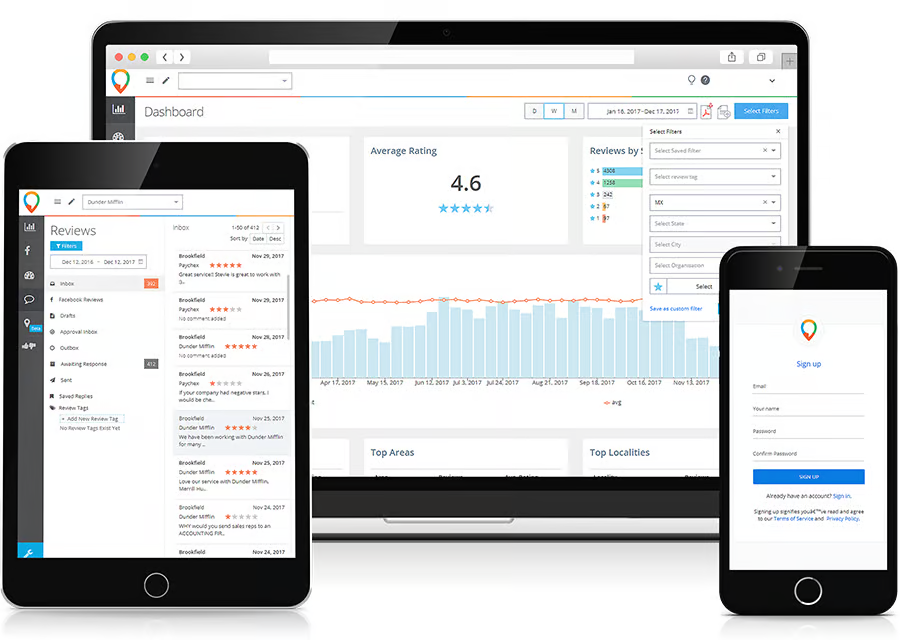 En esencia, Synup se destaca por la agregación de reseñas de más de 60 fuentes diferentes, incluidas Google, Facebook, Yelp y TripAdvisor, así como de sitios específicos de la industria. Nuestro panel de control centralizado ofrece una vista panorámica de su presencia en línea, lo que le ahorra la molestia de tener que hacer malabares con múltiples plataformas.