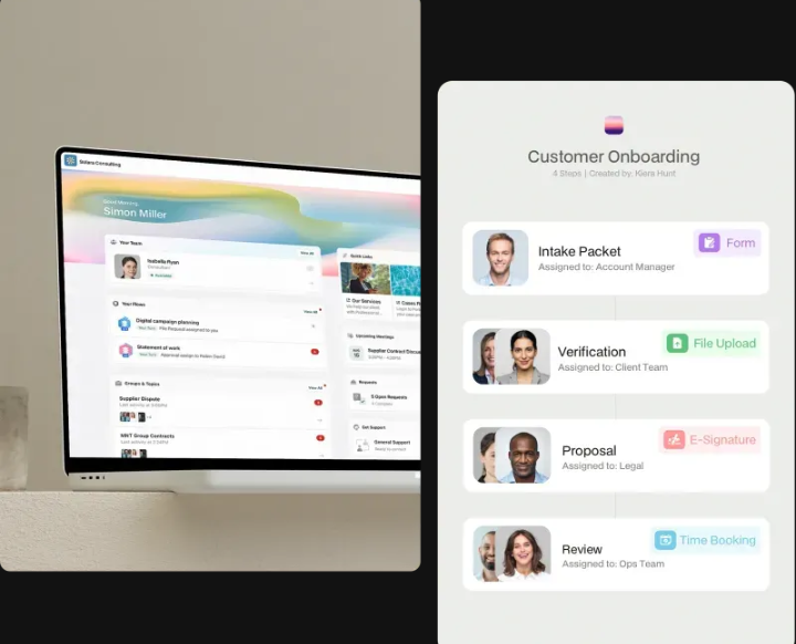 Es fácil empezar con nuevos clientes a través del intuitivo proceso de incorporación de Clientjoy. Al utilizar flujos de trabajo personalizables y acciones automáticas, puedes crear un proceso de incorporación fluido para tu equipo y tus clientes.