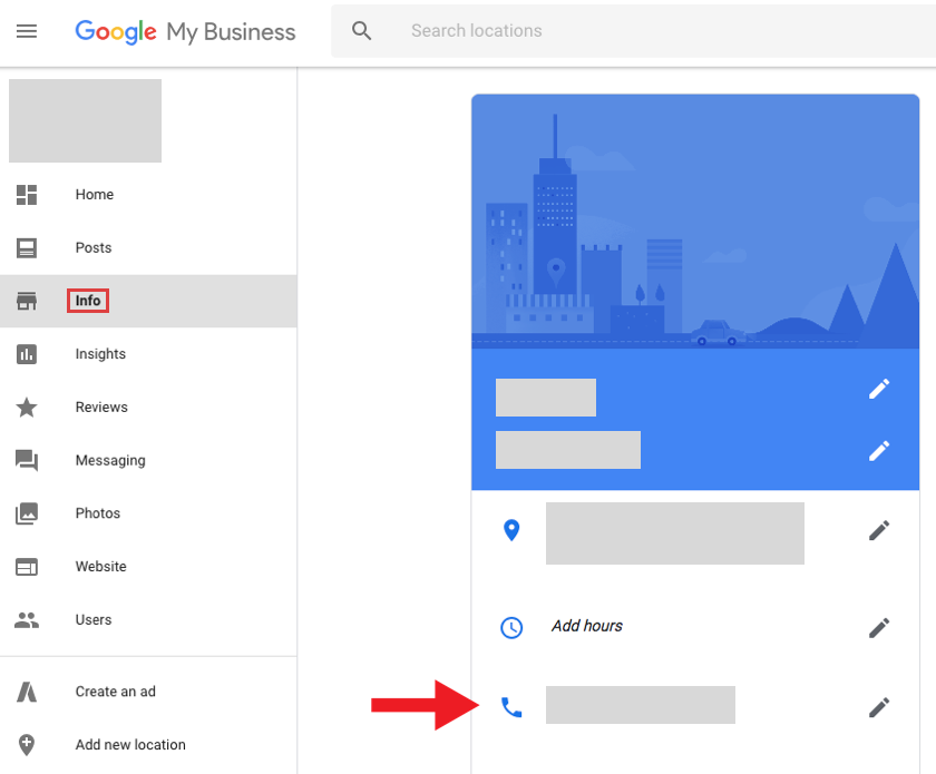 Una vez que estés en la pestaña Información de tu perfil de Google My Business, podrás ver un icono azul de ubicación debajo del nombre y la categoría de tu empresa. Esto te mostrará la dirección de tu empresa si has añadido algo en el pasado, o simplemente te dirá «Añadir dirección».