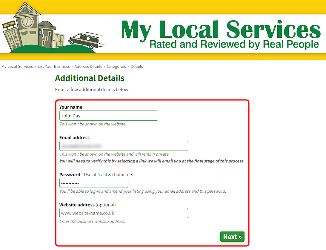 Paso 7: Ingresa tu información adicional, incluidos el nombre, la dirección de correo electrónico, el número de teléfono, la URL del sitio web y la contraseña. Asegúrese de completar todos los campos obligatorios marcados con un asterisco (*).