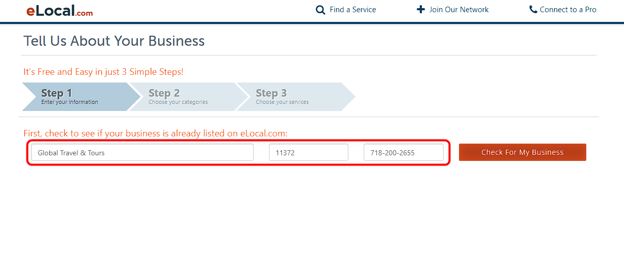 Paso 3: Lo siguiente es introducir la información de su empresa y hacer clic en «Comprobar si mi empresa» ya aparece en eLocal.com o no.